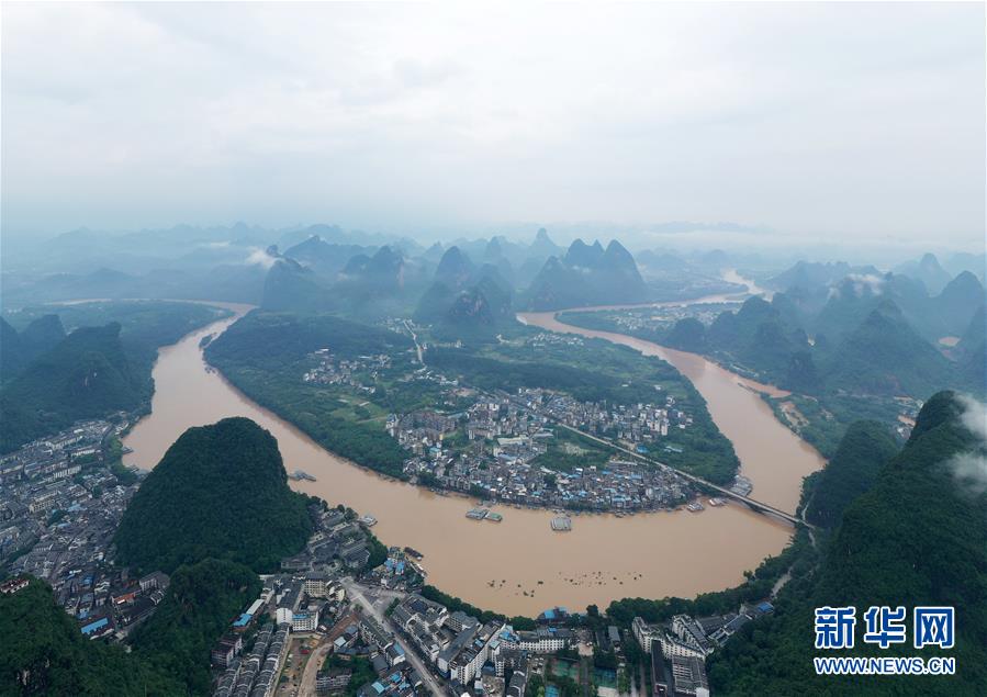 這是洪水奔流的漓江流過廣西陽朔縣境內(nèi)(6月8日攝,無人機照片)。6月6日至8日,廣西陽朔縣普降暴雨,局部降特大暴雨,全縣9個鄉(xiāng)鎮(zhèn)出現(xiàn)洪澇災害。目前,全縣正有序開展災后生產(chǎn)生活恢復。新華社記者陸波岸攝