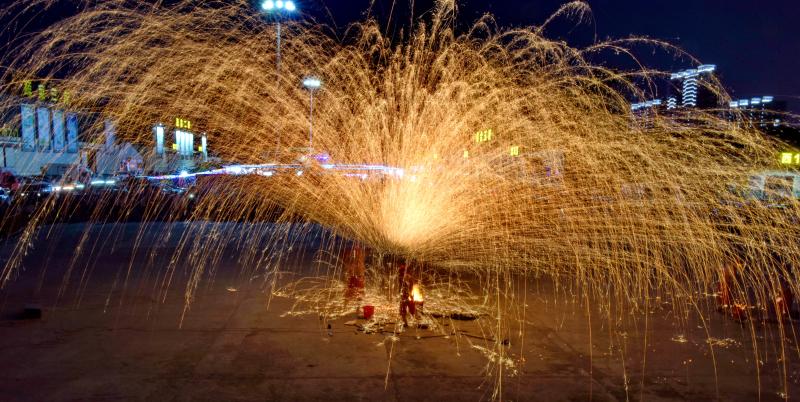 2020年6月7日晚8時(shí)許,吉林長春青岡立交橋附近,神韻打鐵花表演隊(duì)改進(jìn)了傳統(tǒng)單一的擊打鐵花的形式,增添了空中轉(zhuǎn)花、高空散花、鋪地印花等多種花型。一柱鐵花沖天,在空中盤旋,朵朵銀花綻放給觀眾帶來了震撼的視覺享受。