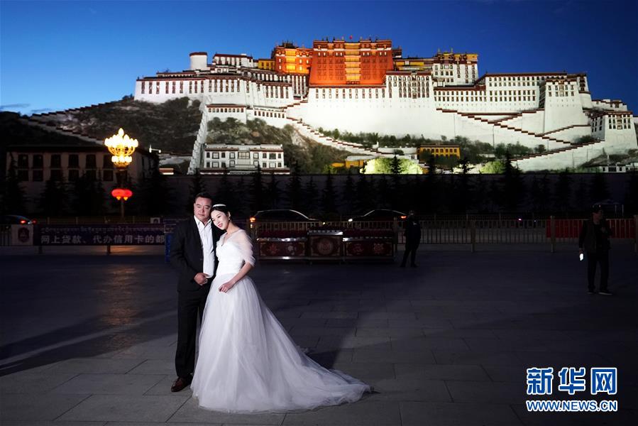 游客在布達(dá)拉宮廣場(chǎng)拍照(6月8日攝)。夜幕降臨,西藏拉薩布達(dá)拉宮燈光璀璨,夜景迷人。新華社記者詹彥攝