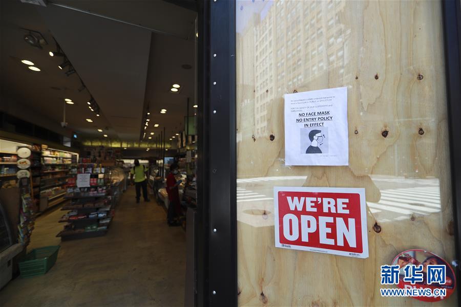 6月8日,美國紐約一家商店的門口貼著佩戴口罩方可進(jìn)入的提示。在因新冠疫情進(jìn)入“居家令”近三個月之后,美國紐約市于當(dāng)?shù)貢r間8日開始“解封”,進(jìn)入經(jīng)濟(jì)重啟的第一階段。新華社記者王迎攝
