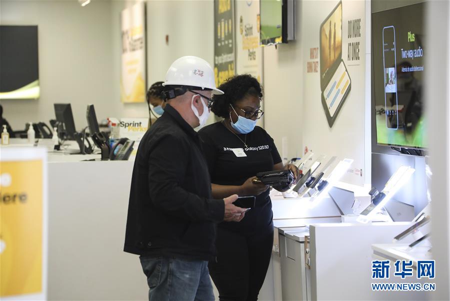 6月8日,店員(右)在美國紐約一家電信運營商營業(yè)廳內(nèi)為顧客服務(wù)。在因新冠疫情進入“居家令”近三個月之后,美國紐約市于當(dāng)?shù)貢r間8日開始“解封”,進入經(jīng)濟重啟的第一階段。新華社記者王迎攝