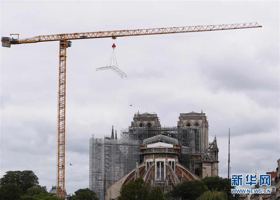 這是6月9日在法國巴黎拍攝的正在進行腳手架拆除工作的巴黎圣母院。法國巴黎圣母院于8日開始拆除去年大火中被焚的腳手架。作為巴黎圣母院修復(fù)工作的重要組成部分,這項工程預(yù)計將持續(xù)至少3個月。2019年4月15日,巴黎圣母院遭遇大火,當時圣母院正在進行維修,搭建的腳手架在火災(zāi)中損毀、變形。新華社記者高靜攝