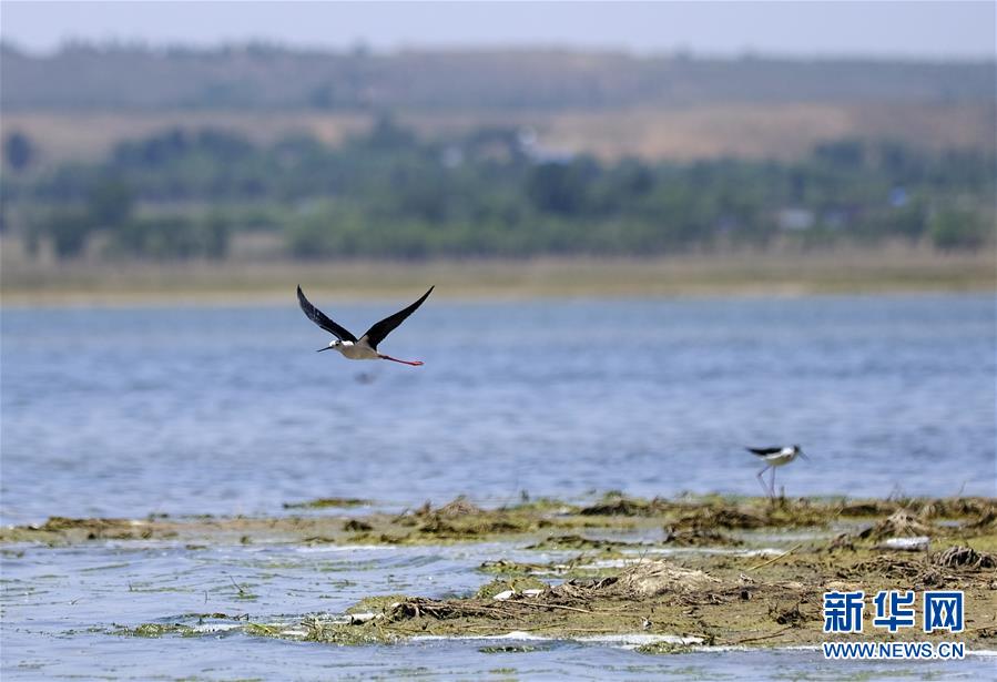 這是6月9日在泊江海子拍攝的黑翅長腳鷸。近年來,在當?shù)卣亩喾N措施治理下,曾經(jīng)水面萎縮的內(nèi)蒙古自治區(qū)鄂爾多斯市境內(nèi)的泊江海子水量逐漸恢復(fù)。近期,包括遺鷗在內(nèi)的40多種鳥類來此棲息,泊江海子重新成為鳥類的樂園。新華社記者賈立君攝