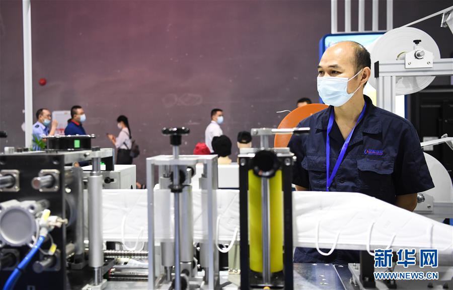 6月10日拍攝的展會上的一臺口罩生產(chǎn)設(shè)備。當(dāng)日,廣州國際防疫物資展覽會在保利世貿(mào)博覽館舉行。本次展會面積共計(jì)3.6萬平方米,設(shè)有防疫產(chǎn)品、設(shè)備、綜合服務(wù)、原輔料等4個展區(qū),參展企業(yè)約600家。新華社記者鄧華攝