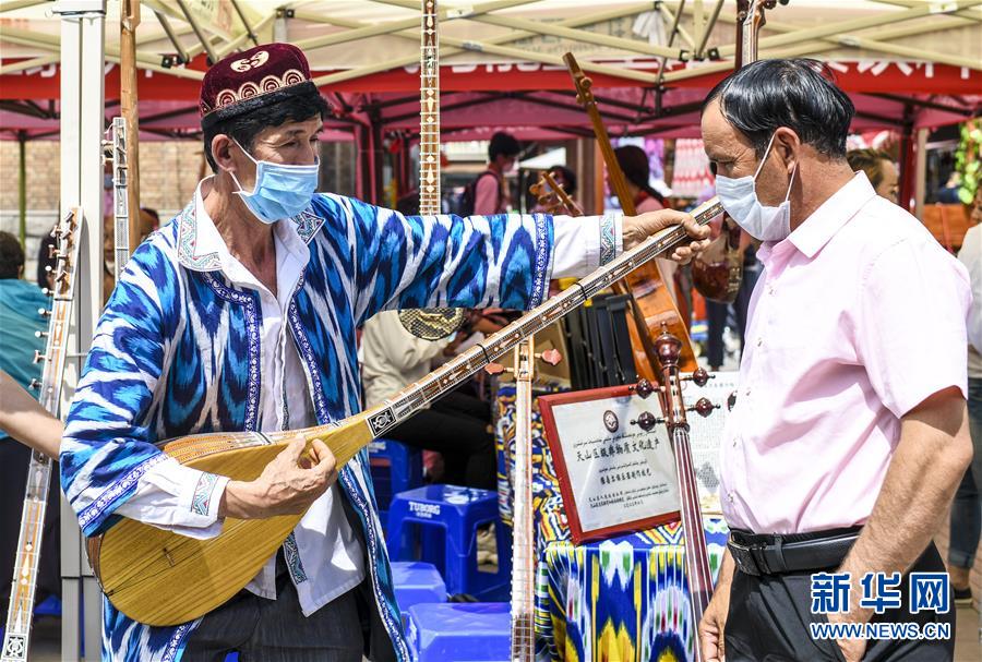 6月12日,在位于烏魯木齊大巴扎景區(qū)內(nèi)的活動現(xiàn)場,新疆維吾爾自治區(qū)非物質(zhì)文化遺產(chǎn)傳承人艾爾肯·吐么爾(左)在“維吾爾族樂器制作技藝”非遺項目展區(qū)演奏都塔爾。6月12日,“文旅融合,文物賦彩,非遺傳承,健康生活”2020年烏魯木齊市天山區(qū)文化和自然遺產(chǎn)日推介展演活動在大巴扎景區(qū)舉辦,吸引不少游客和市民觀賞。新華社記者王菲攝。