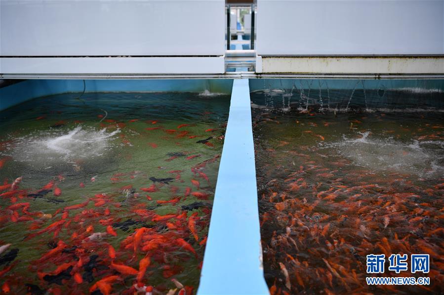 在天津現(xiàn)代晨輝科技集團(tuán)有限公司的養(yǎng)殖示范場,工人在投喂飼料(6月15日攝)。近年來,天津市寶坻區(qū)大白莊鎮(zhèn)大力發(fā)展觀賞魚養(yǎng)殖,在當(dāng)?shù)佚堫^企業(yè)的帶動(dòng)下,成為增加農(nóng)民收入的新途徑。據(jù)了解,企業(yè)對附近養(yǎng)殖戶統(tǒng)一提供苗種、飼料、技術(shù)支持,以及觀賞魚成魚后保價(jià)回收的服務(wù)。養(yǎng)殖戶每畝水面平均收入約1.8萬元,解決周邊農(nóng)民就業(yè)近200人。新華社記者 李然 攝