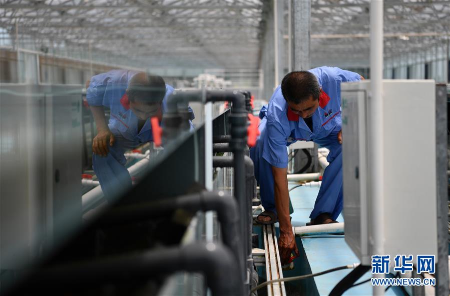 在天津現(xiàn)代晨輝科技集團(tuán)有限公司的養(yǎng)殖示范場(chǎng),工人在調(diào)試設(shè)備(6月15日攝)。新華社記者 李然 攝