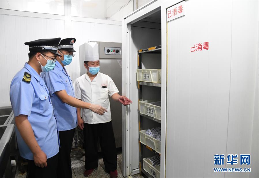 6月17日,在位于北京市海淀區(qū)的海碗居增光路店,執(zhí)法人員對店內(nèi)碗筷的消毒情況進(jìn)行檢查。新華社記者 任超 攝