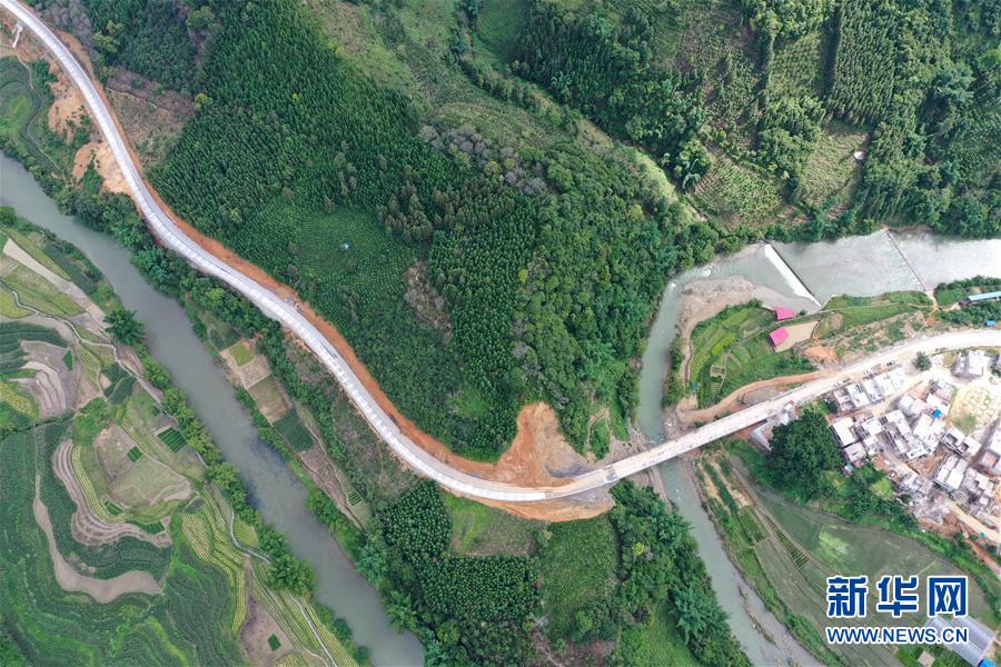 正在建設(shè)的百坭村二級(jí)公路(6月17日攝,無人機(jī)照片)。