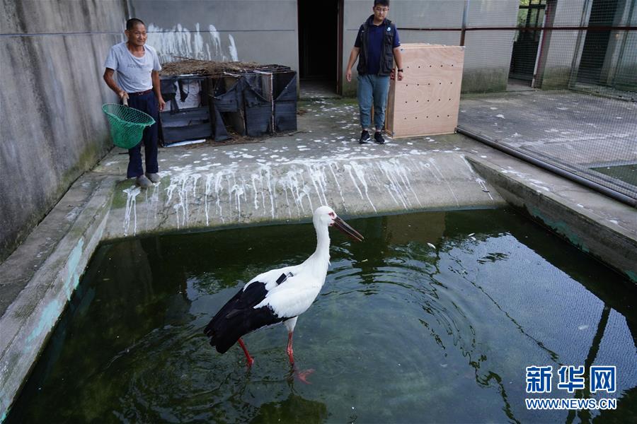 6月17日,工作人員準(zhǔn)備將三只東方白鸛裝箱。新華社記者 周密 攝