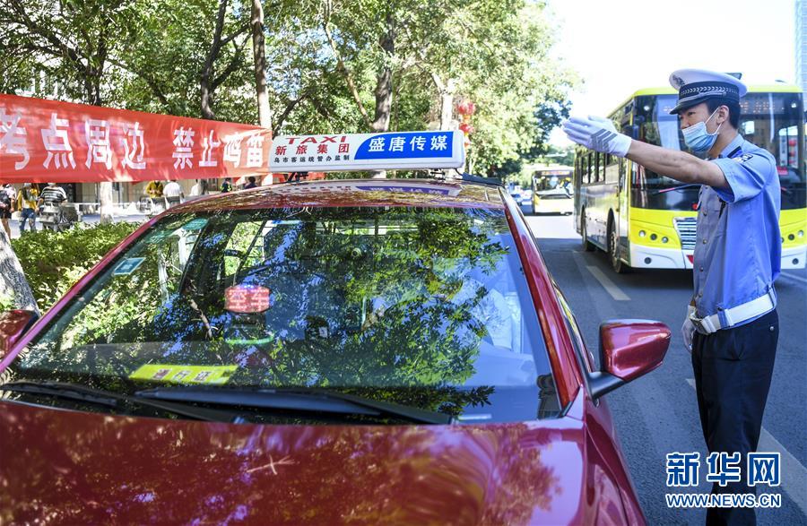 6月20日,在烏魯木齊市第十一中學(xué)門前,烏魯木齊市公安局交警支隊天山區(qū)大隊新華路中隊警官肖健波提醒過往車輛減速慢行、禁止鳴笛。當(dāng)日,烏魯木齊市初中升高中考試開始。為保障為期三天的中考順利進(jìn)行,烏魯木齊市公安局交警支隊在各考點(diǎn)執(zhí)勤,為考生保駕護(hù)航新華社記者 王菲 攝