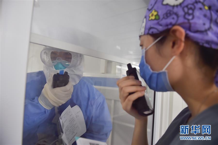 6月19日,在北京地壇醫(yī)院隔離病房內(nèi),護士正在用對講機和外面交流。新華社記者彭子洋攝