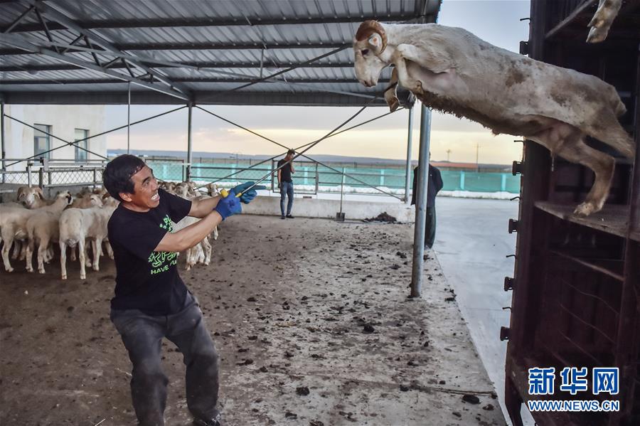 6月12日,在內(nèi)蒙古烏蘭察布東來順肉類加工廠內(nèi),工人將貨車上的綿羊引下車。近年來,京蒙對口幫扶的力度不斷加大。越來越多的北京企業(yè)來到烏蘭察布,通過多種方式幫助當?shù)刎毨У貐^(qū)的農(nóng)牧民擺脫貧困、走上致富路。新華社記者彭子洋攝