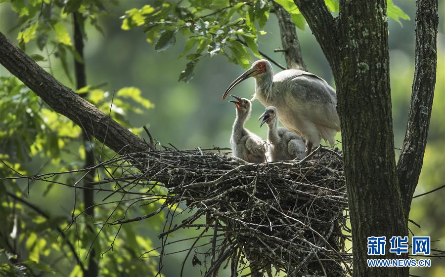 在陜西省漢中市洋縣四郎鎮(zhèn)田嶺村的一片密林里,朱鹮在巢里照看幼鳥(2018年6月2日攝)。記者22日從陜西省林業(yè)局了解到,據不完全統(tǒng)計,曾幾近滅絕的朱鹮,其全球種群數(shù)量已超過5000只,其中中國境內4400只,棲息地呈現(xiàn)出以秦嶺為中心向東亞歷史分布地擴展的趨勢。新華社記者陶明攝