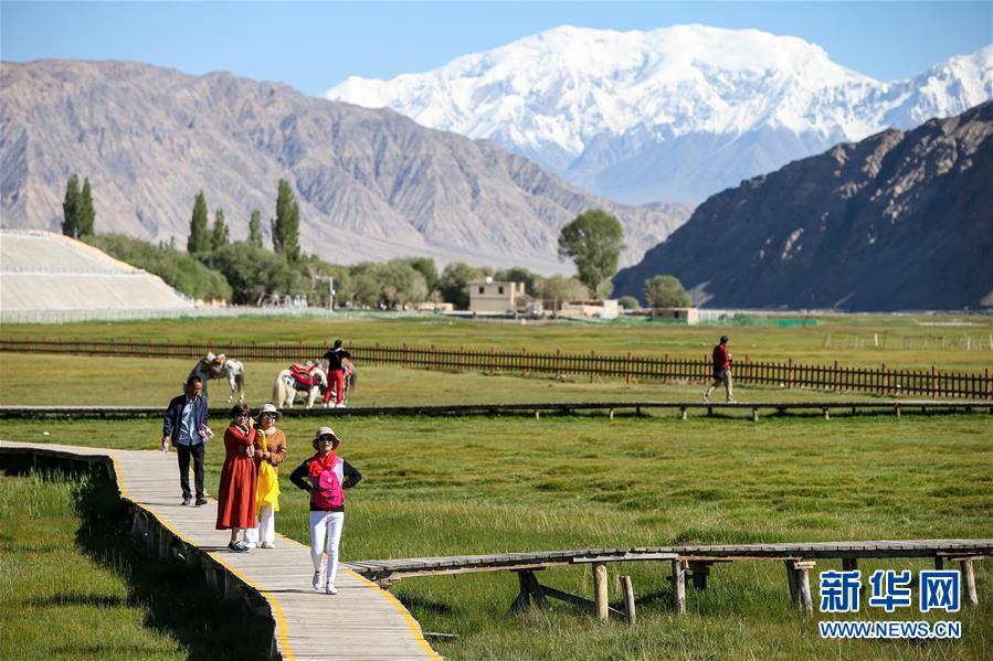 游客在新疆塔什庫爾干塔吉克自治縣金草灘濕地公園游玩(2019年7月9日攝)。新華社記者李京攝