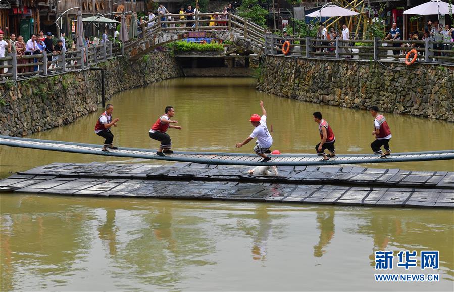 在廣西融水雙龍溝森林旅游度假區(qū)夢(mèng)嗚苗寨,幾位搬遷戶協(xié)助游客挑戰(zhàn)“搖擺橋”(6月21日攝)。近年來(lái),融水打造原生態(tài)苗族文化體驗(yàn)園——夢(mèng)嗚苗寨,讓搬遷進(jìn)城的貧困戶住進(jìn)復(fù)原建設(shè)的老房子。景區(qū)提供綠化保潔、游樂(lè)設(shè)施管理、民族歌舞表演等工作崗位,多渠道增加貧困戶收入。新華社記者黃孝邦攝