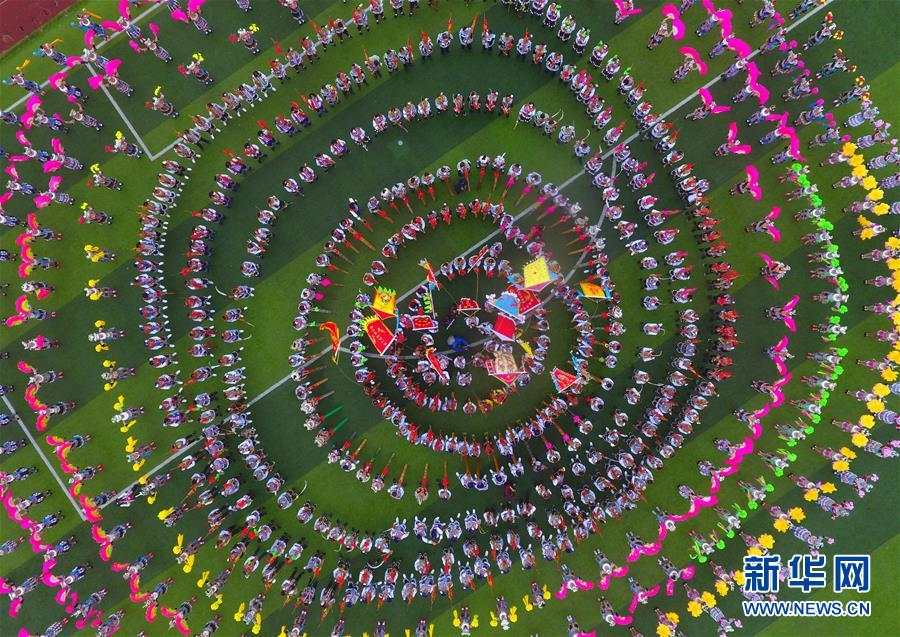 在廣西融水苗族自治縣民族體育公園,當地群眾在蘆笙斗馬節(jié)開幕式上表演歌舞(無人機照片,2017年11月18日攝)。新華社記者黃孝邦攝