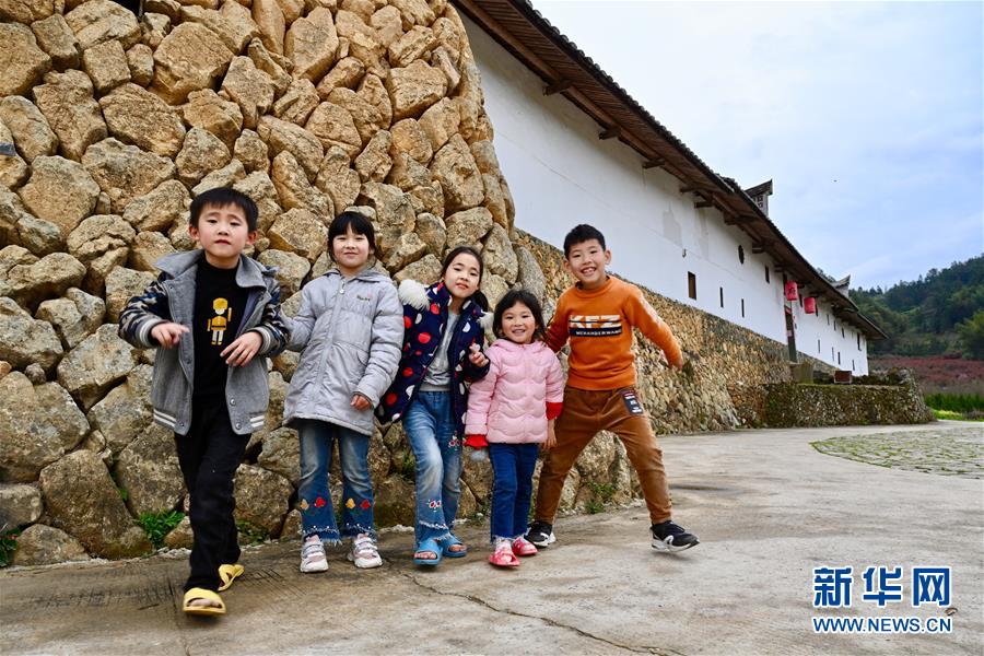 名兒童在福建省永泰縣同安鎮(zhèn)傳統(tǒng)莊寨建筑愛荊莊前玩耍(3月19日攝)。新華社記者姜克紅攝