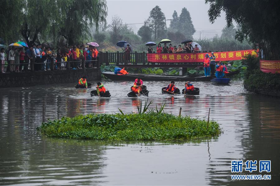 6月23日,東林鎮(zhèn)村民在泉心村荷花池參加端午劃菱桶趣味活動(dòng)。當(dāng)日,浙江省湖州市東林鎮(zhèn)在泉心村荷花池舉辦“慶端午劃菱桶”趣味活動(dòng)。村民們劃著菱桶在水面上你追我趕,同時(shí)采收荷花和蓮蓬,呈現(xiàn)出水鄉(xiāng)特有的端午節(jié)日氛圍。在河網(wǎng)密布的東林鎮(zhèn),菱桶是水鄉(xiāng)家家戶戶都有的一種傳統(tǒng)水上勞動(dòng)工具,村民在捕魚、采菱、采荷時(shí)都要用到。新華社記者徐昱攝