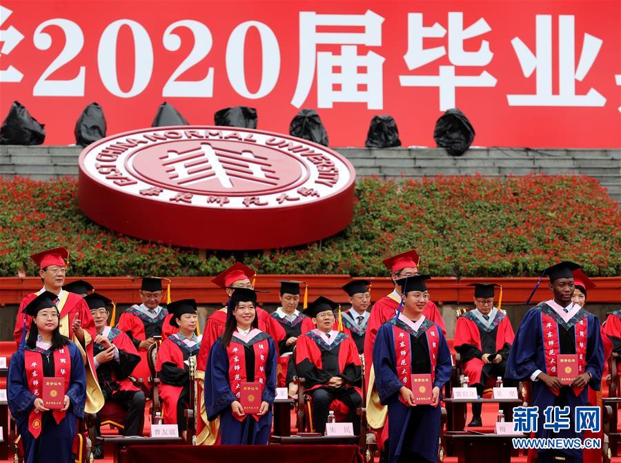 6月23日,在華東師范大學閔行校區(qū)的畢業(yè)典禮上,優(yōu)秀畢業(yè)生代表接受表彰。當日,華東師范大學舉行2020屆畢業(yè)典禮。由于疫情防控需要,今年的典禮在兩個校區(qū)分別舉辦,并全程在線直播。約7700名華東師范大學2020屆畢業(yè)生通過現(xiàn)場或“云端”的方式參加畢業(yè)典禮。新華社記者劉穎攝