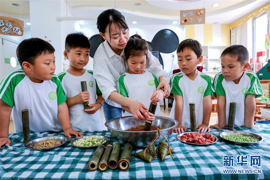 6月23日,長興縣李家巷鎮(zhèn)中心幼兒園的孩子們在老師的帶領下,一起學習制作端午粽子和竹筒飯。為了迎接即將到來的端午節(jié),浙江省湖州市長興縣各個幼兒園開展“品民俗迎端午”主題活動,讓小朋友們體驗傳統(tǒng)民俗文化。新華社記者徐昱攝