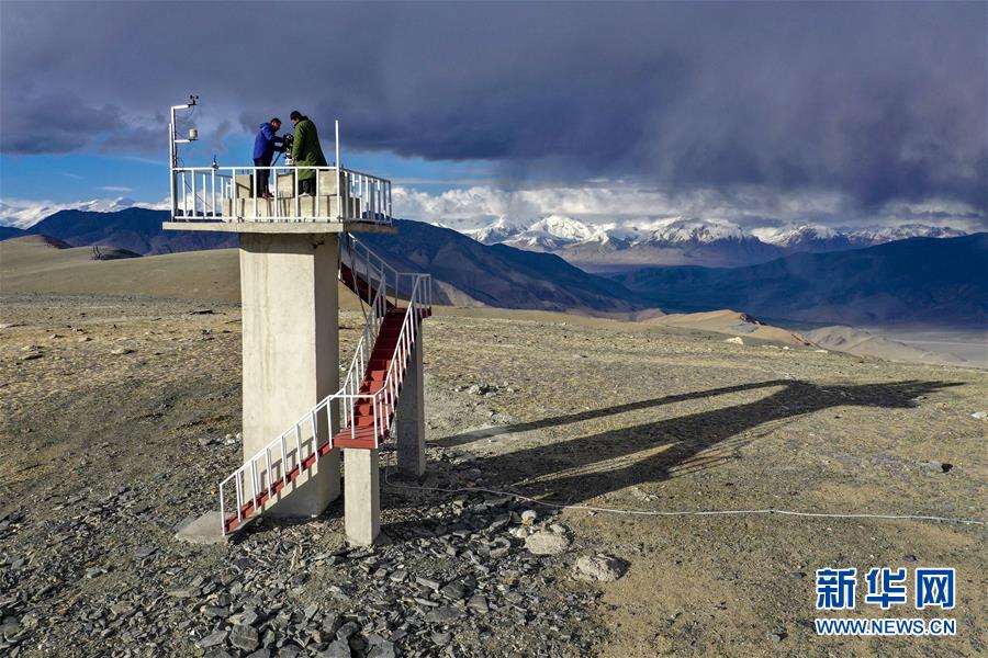 在中國(guó)科學(xué)院新疆天文臺(tái)慕士塔格觀測(cè)站,馮國(guó)杰和助理觀測(cè)員在戶外工作(6月15日攝,無人機(jī)照片)。新華社記者胡虎虎攝