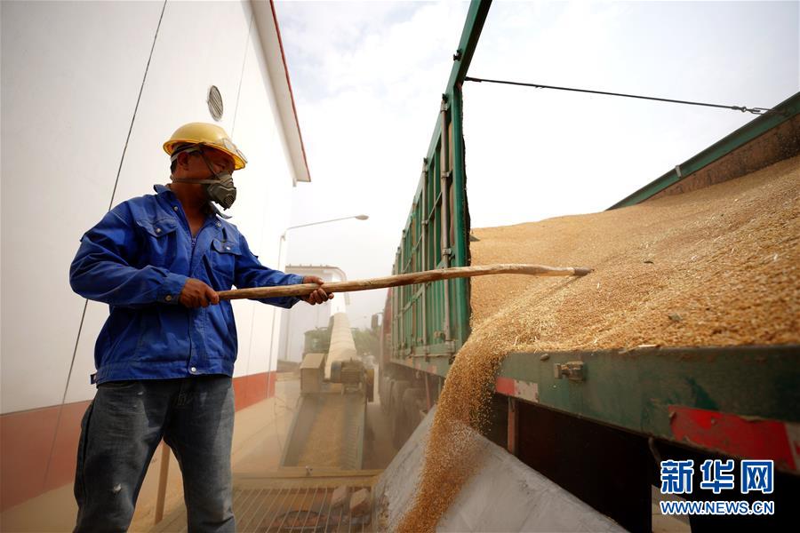 6月23日,在河北柏鄉(xiāng)國(guó)家糧食儲(chǔ)備庫(kù),工作人員將小麥入庫(kù)。麥?zhǔn)者^(guò)后,河北柏鄉(xiāng)國(guó)家糧食儲(chǔ)備庫(kù)積極騰倉(cāng)納糧,做好夏糧收儲(chǔ)入庫(kù)工作,確保農(nóng)民順利賣糧。新華社記者王曉攝