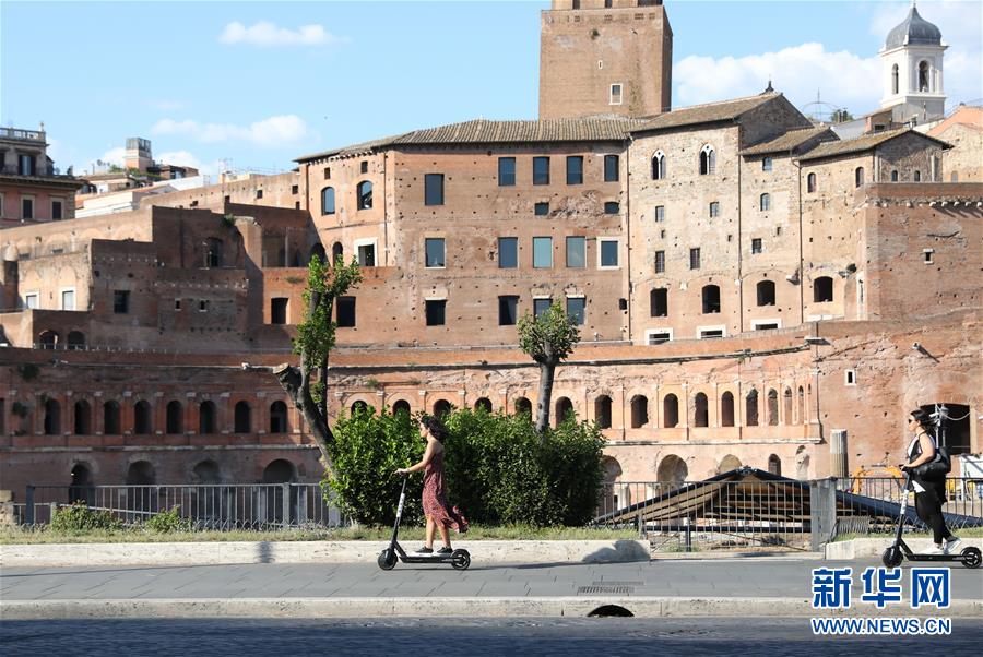 6月23日,在意大利首都羅馬,人們騎著電動踏板車在城市中穿行。新華社記者程婷婷攝