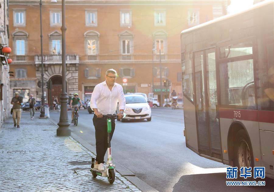6月23日,在意大利首都羅馬,一名男子騎著電動(dòng)踏板車(chē)在城市中穿行。新華社記者程婷婷攝