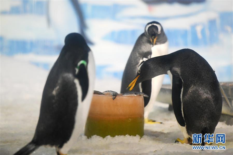 6月24日,哈爾濱極地館的企鵝在享用工作人員送來的美食。當(dāng)日,哈爾濱極地館的工作人員特地準(zhǔn)備了“魚粽”“肉粽”,讓生活在這里的極地動物也品嘗一下端午美食。新華社記者王建威攝