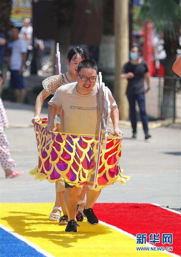 6月25日,在重慶市涪陵區(qū)美心紅酒小鎮(zhèn)舉辦的端午傳統(tǒng)民俗體驗(yàn)活動(dòng)中,市民參加“旱地龍舟”比賽。新華社記者 黃偉 攝