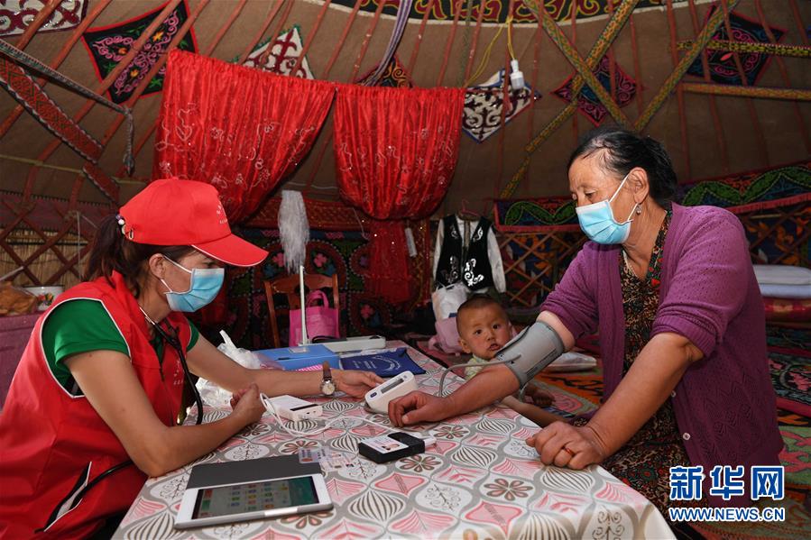 新疆布爾津縣也格孜托別鄉(xiāng)醫(yī)生布勒布勒古麗·金恩斯汗(左)給牧民檢查身體。新華社記者沙達提攝