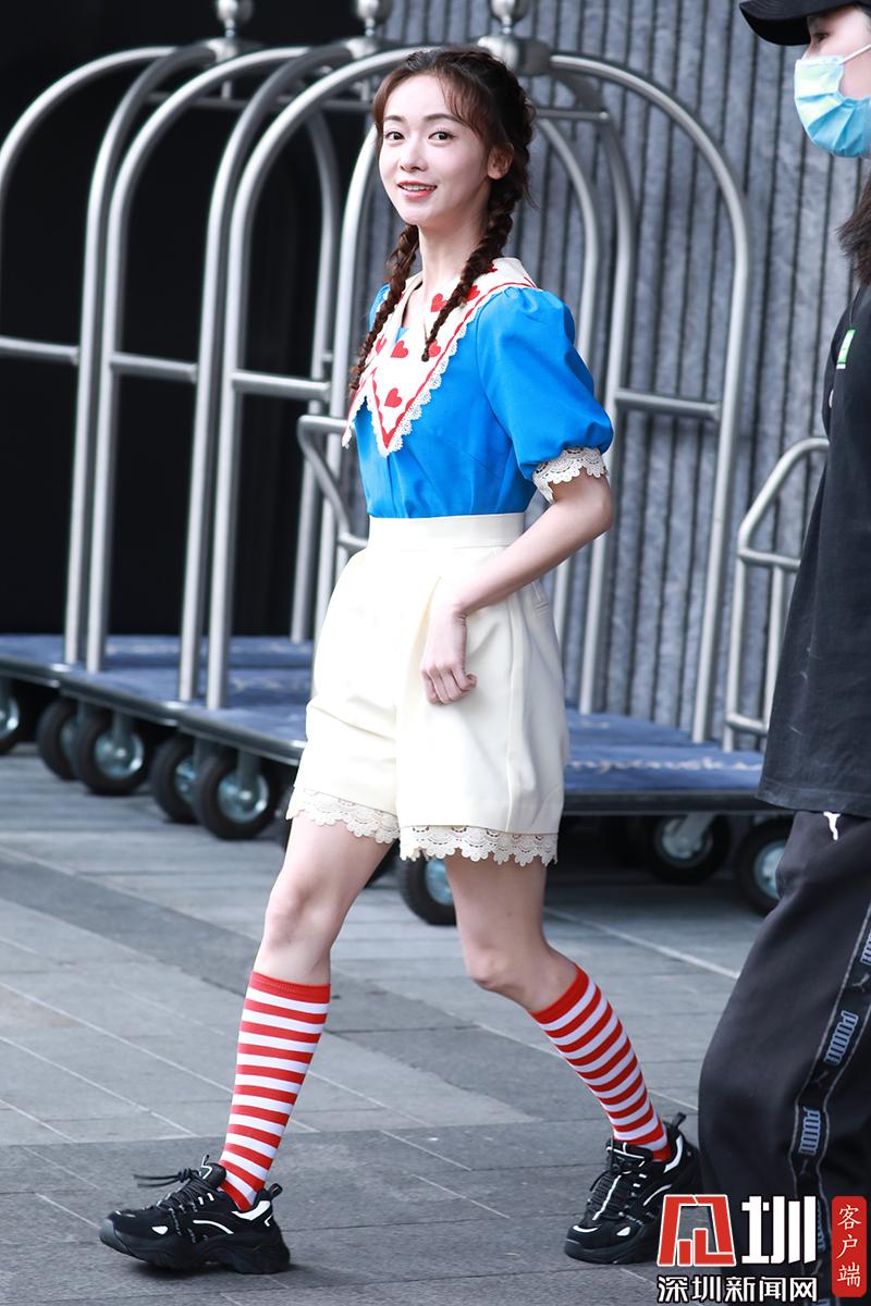 吳謹言身穿藍色上衣搭配白裙秀美腿,少女感十足。