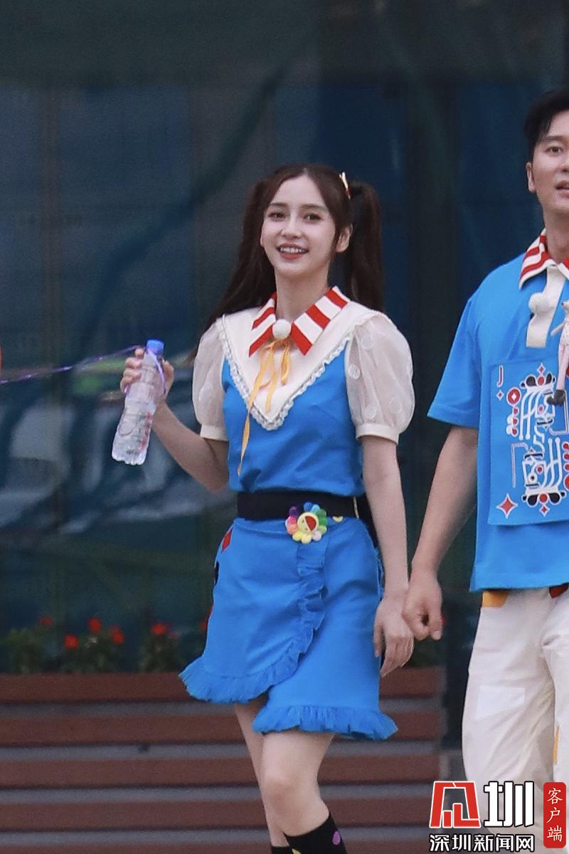 楊穎(angelababy)穿藍色背帶裙扎雙馬尾清新可愛