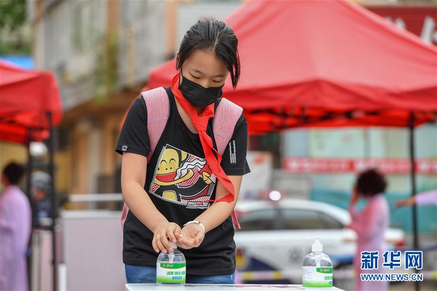 6月29日,在吉林市第一實驗小學(xué),學(xué)生進(jìn)行手部消毒。新華社記者張楠攝