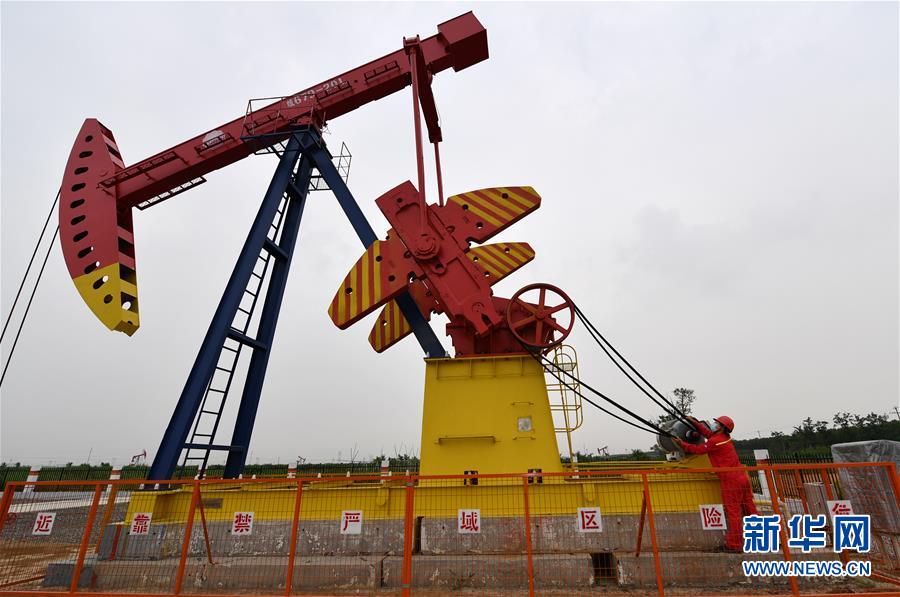 6月29日,馮萌萌在大港油田采油二廠二區(qū)內(nèi)檢查機(jī)器皮帶磨損情況。新華社記者李然攝