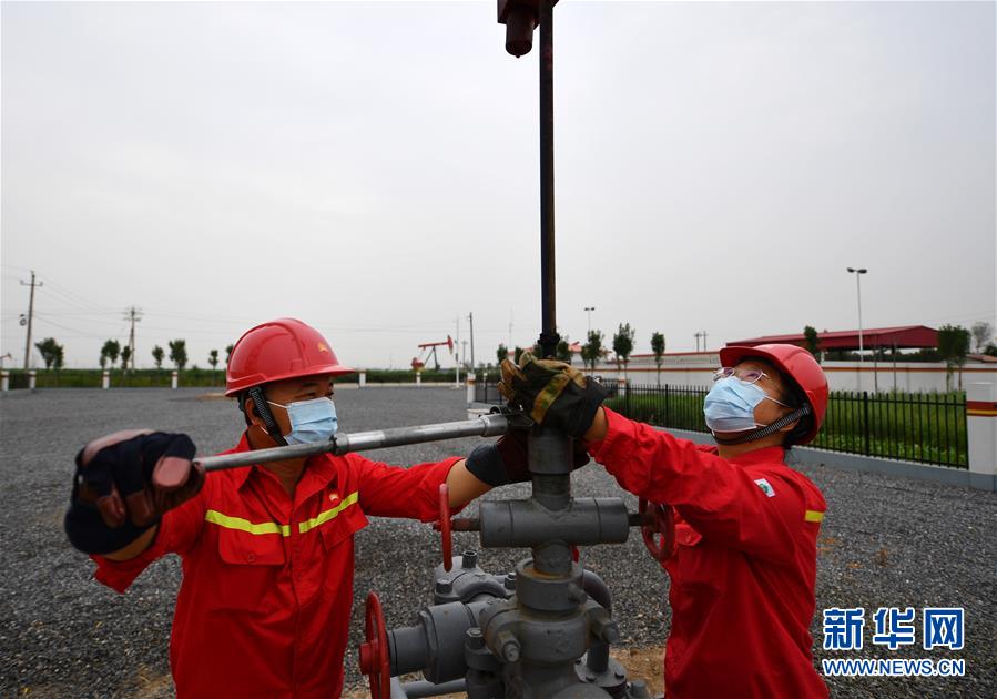 6月29日,馮萌萌(右)和同事在大港油田采油二廠二區(qū)內(nèi)查看設備運行情況。新華社記者李然攝