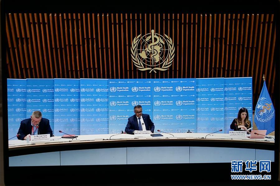 這是6月29日在比利時(shí)布魯塞爾拍攝的世界衛(wèi)生組織總干事譚德塞(中)在瑞士日內(nèi)瓦出席線上記者會(huì)。新華社記者張鋮攝