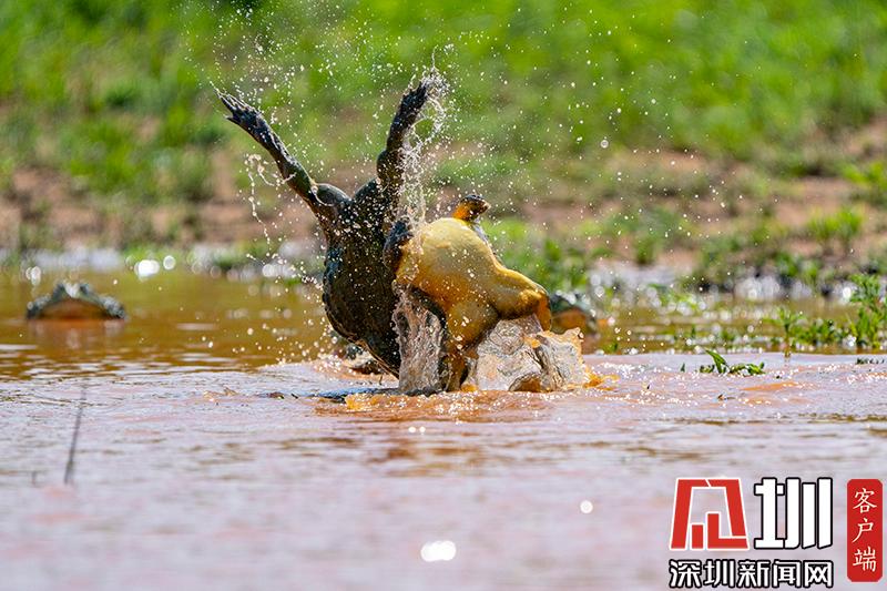 2020年6月30日報(bào)道(具體拍攝時(shí)間不詳),南非波羅克瓦克,兩只雄性非洲牛蛙為了爭奪雌性牛蛙,在池塘中打架,這樣的情形十分罕見。畫面中,戰(zhàn)況十分激烈,一只非洲牛蛙在另外一只試圖逃到池塘邊緣時(shí)撕咬對(duì)手,甚至將另外一只拋向空中。這些精彩的照片是由南非開普敦?cái)z影師Temujin Johnson拍攝的。