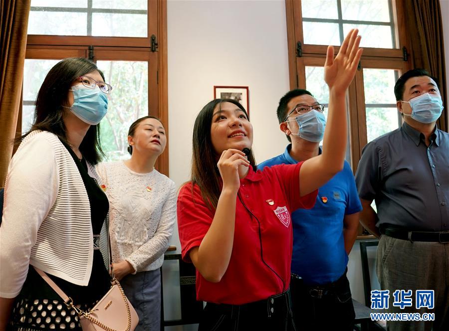 6月30日,復(fù)旦大學(xué)《共產(chǎn)黨宣言》展示館黨員志愿服務(wù)隊(duì)隊(duì)員、復(fù)旦大學(xué)馬克思主義學(xué)院博士生陸婷婷(中)在為觀眾講解。新華社記者劉穎攝