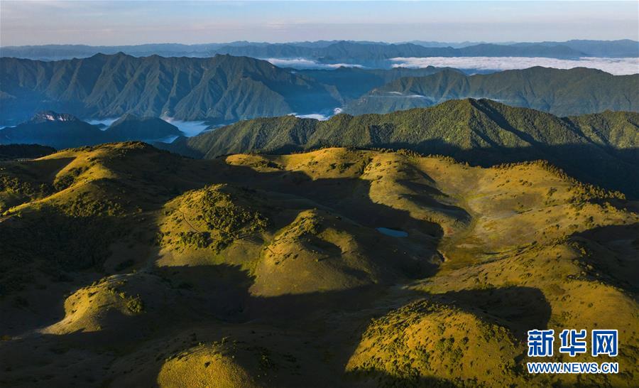 6月30日,朝霞照耀下的神田草甸與遠(yuǎn)處的群峰(無人機(jī)照片)。位于陜西省安康市嵐皋縣與重慶市城口縣交界處大巴山神田主脊北坡的神田草甸,面積超過1.1萬畝。夏日的朝霞中,起伏的草甸仿佛一塊寬大無邊的綠色地毯,鑲嵌在大巴山上,如詩如畫。新華社記者陶明攝