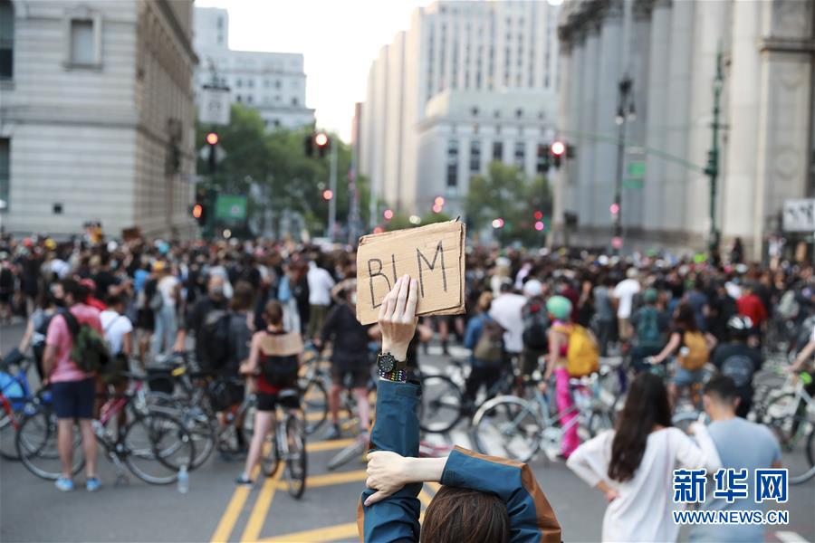 6月30日,一名抗議者在美國紐約市政廳附近手舉寫有“黑人的命也是命”縮寫的標語參加抗議活動。由美國明尼蘇達州明尼阿波利斯市非裔男子弗洛伊德遭白人警察暴力執(zhí)法而死一事引發(fā)的各種抗議活動仍在紐約持續(xù)進行。新華社記者王迎攝