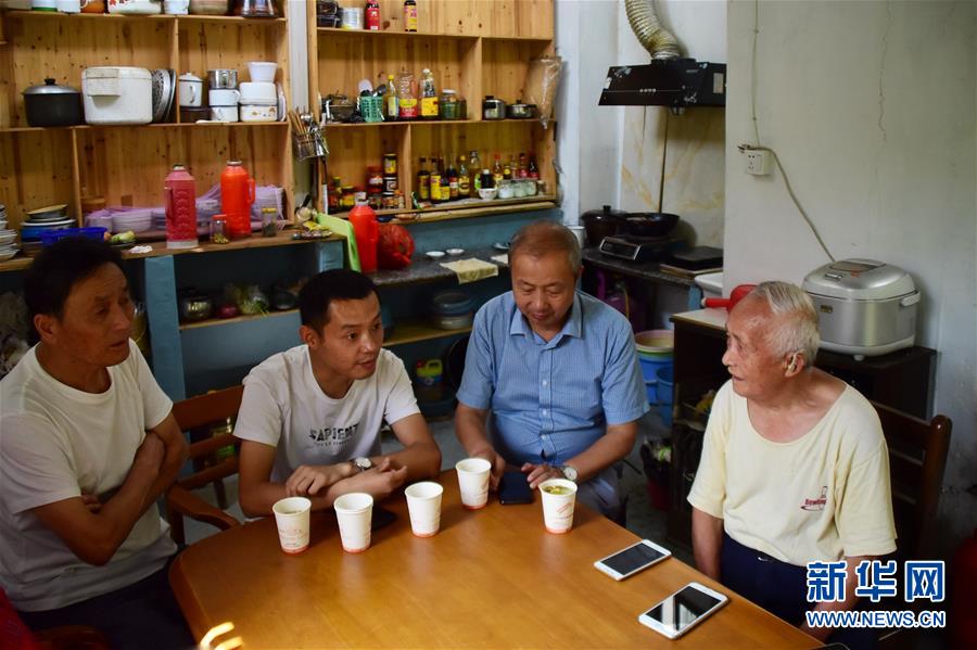 6月30日,第二代放映人朱文炳(左一)、第四代放映人朱強(qiáng)(左二)與第三代放映人朱生榮(右二)來看望第一代放映人王志華(右一)。新華社記者鄭夢(mèng)雨攝
