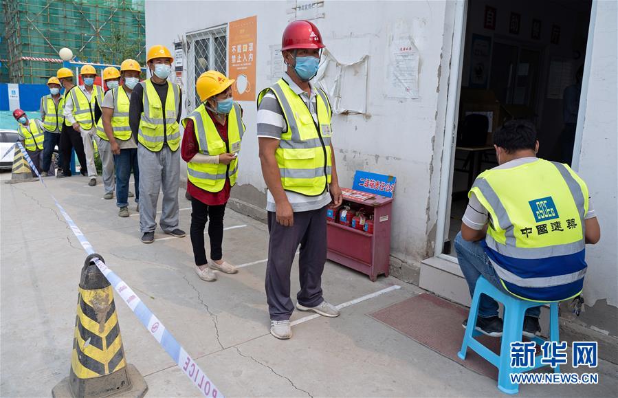 7月2日,在北京市大興區(qū)中建三局二公司北京公司一項(xiàng)目建筑工地的臨時(shí)核酸檢測(cè)采樣點(diǎn),建筑工地人員排隊(duì)等候采樣。