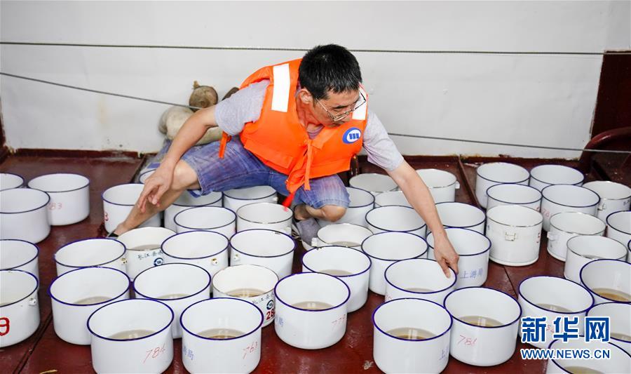 7月2日,長(zhǎng)江清溪場(chǎng)水文站站長(zhǎng)朱輝在水文作業(yè)船上清點(diǎn)長(zhǎng)江水樣。新華社記者劉潺攝