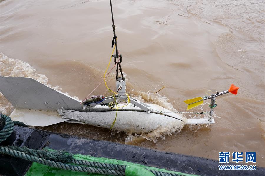 7月2日,裝有流速測(cè)量?jī)x器的鉛魚完成測(cè)量作業(yè)后,由吊車吊出長(zhǎng)江水面。新華社記者劉潺攝