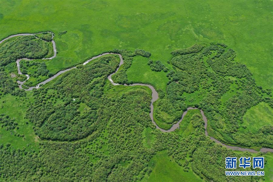 烏蘭毛都草原景色(7月1日無人機照片)。盛夏時節(jié),內(nèi)蒙古興安盟科爾沁右翼前旗的烏蘭毛都草原綠意盎然,風景醉人。烏蘭毛都草原地處大興安嶺南麓,屬丘陵山地草原,風光獨特。新華社記者徐欽攝