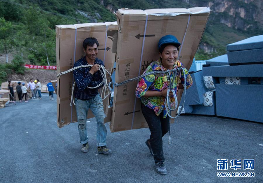 且沙次干、阿達(dá)么日雜夫婦倆背著政府贈(zèng)送的四件套準(zhǔn)備放進(jìn)新居(6月29日攝)。新華社記者 江宏景 攝