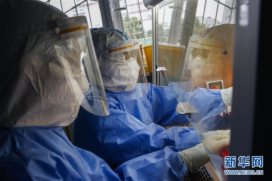 7月3日,中日友好醫(yī)院檢驗(yàn)科新冠核酸檢測(cè)實(shí)驗(yàn)室的檢驗(yàn)人員閆克芹(右)和張?chǎng)卧趯?shí)驗(yàn)室內(nèi)處理剛剛送到的樣本。新華社記者張玉薇攝