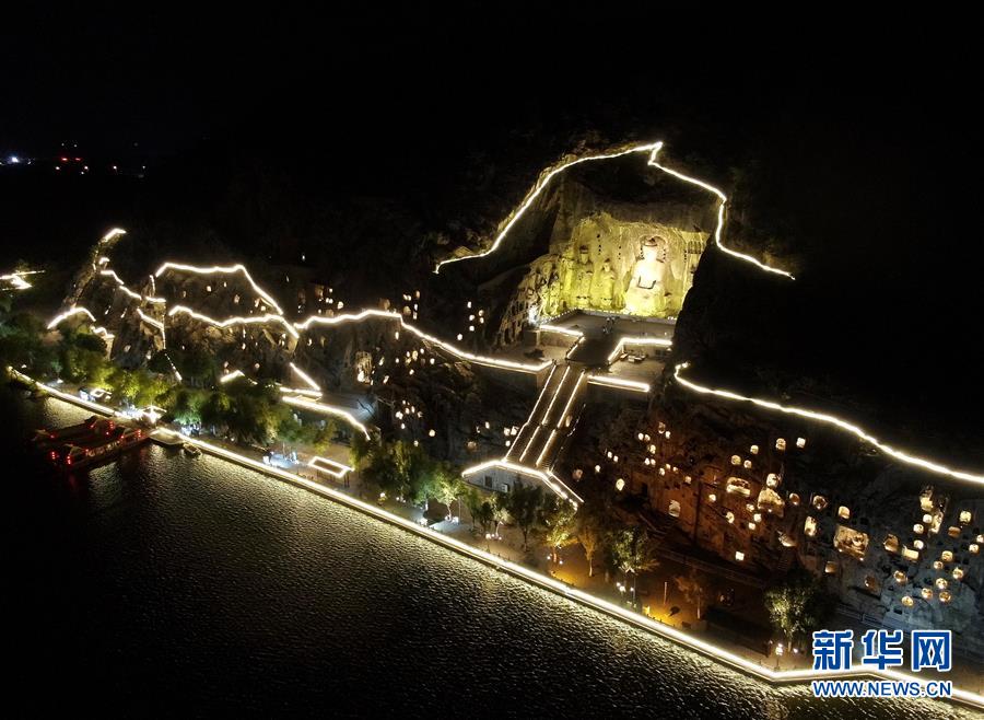 這是6月8日拍攝的洛陽龍門石窟景區(qū)夜景(無人機(jī)照片)。新華社記者 李安 攝